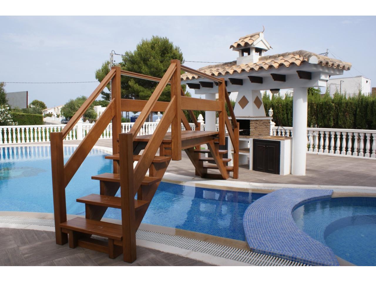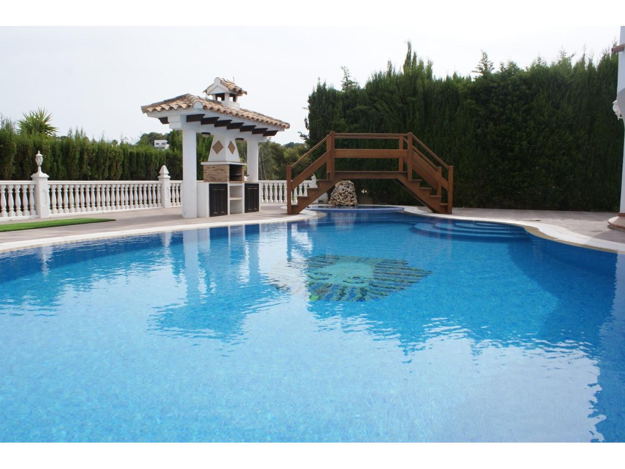 • Descripción Superf. 260 m², 900 m² solar, 5 habitaciones ( 3 suits, 1 doble, 1 individual), 3 baños, esquina, alumbrado, asfaltado, urbanizado, cocina (2), comedor (2), terraza (2), suelos gres catalan, jardín, garaje (cubierto y descubierto), armarios, calefacción, muebles, puerta blindada, vidrios dobles, agua, luz, gas, chimenea, carpintería exterior climalit, carpintería interior, aire acondicionado, orientación Sureste, soleado, piscina, alarma, con 2 salones, barbacoa, piscina interior calefactada, solarium.